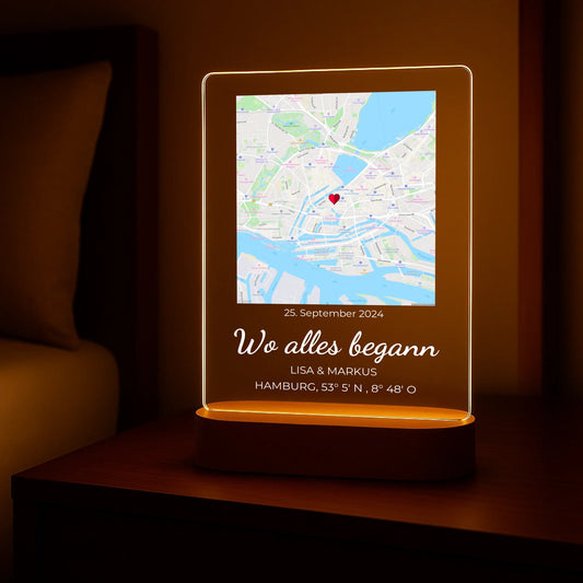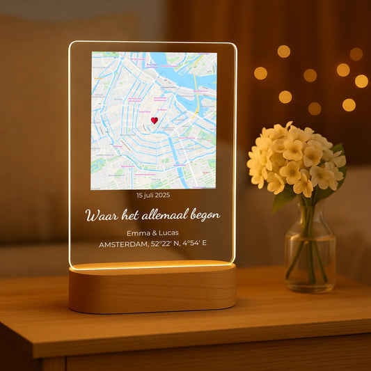 “Waar het begon” – Gepersonaliseerd nachtlampje incl. houten voet
