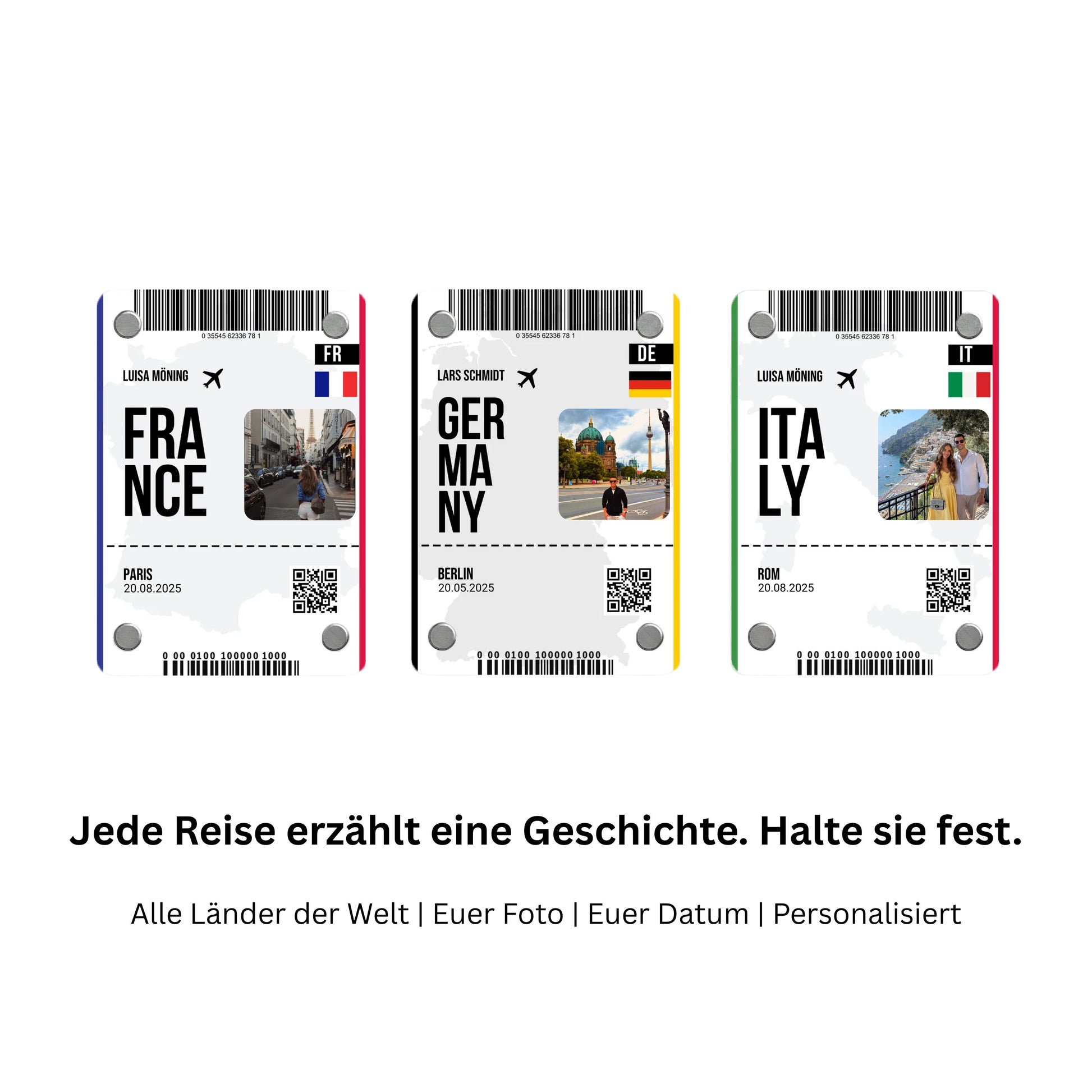 Ob der erste gemeinsame Urlaub, die Hochzeitsreise oder ein spontaner Städtetrip: Dieser personalisierte Acryl-Magnet im Bordkarten-Design macht aus eurem Reisemoment ein kleines Kunstwerk für den Alltag.